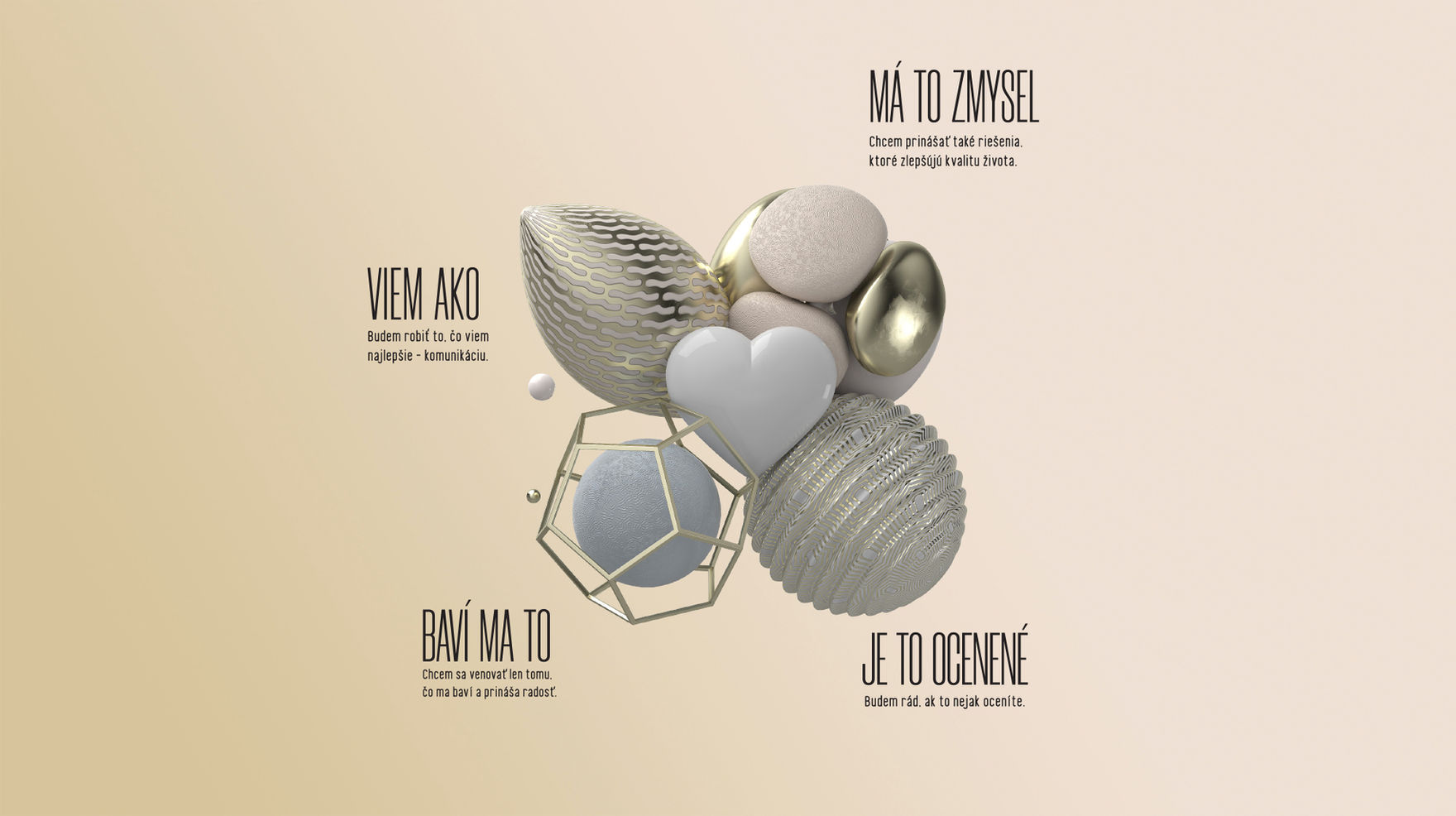 Pri vzniku agentúry sme potrebovali odkomunikovať hodnoty a tézy, na ktorých je postavená. Namiesto nudných grafov či schém sme sa rozhodli ich vizualizovať 3D objektami, ktoré využívame aj v ďalšej v komunikácii.